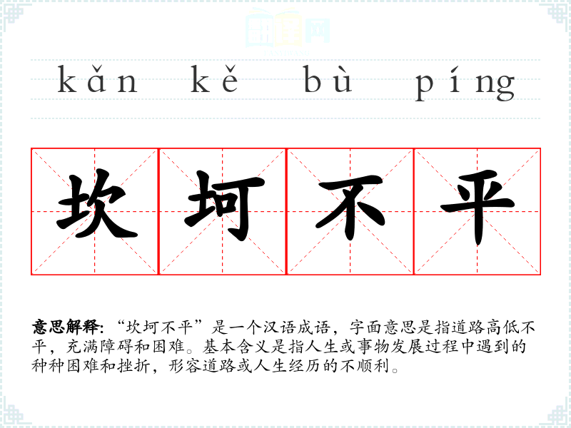 “坎坷不平”是一个汉语成语,字面意思是指道路高低不平,充满障碍和困难。基本含义是指人生或事物发展过程中遇到的种种困难和挫折,形容道路或人生经历的不顺利。