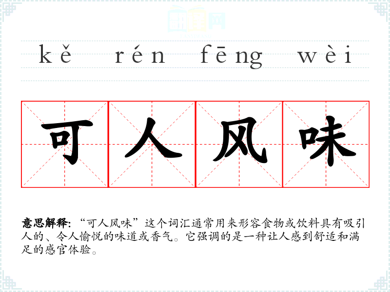“可人风味”这个词汇通常用来形容食物或饮料具有吸引人的、令人愉悦的味道或香气。它强调的是一种让人感到舒适和满足的感官体验。