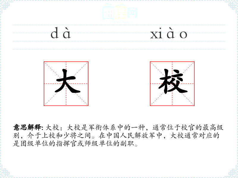 - 对应词汇:在英语中,大校对应的军衔是“Colonel”,在其他语言中也有类似的军衔标识。