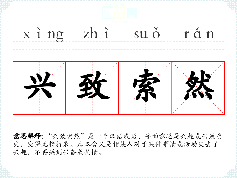 “兴致索然”是一个汉语成语,字面意思是兴趣或兴致消失,变得无精打采。基本含义是指某人对于某件事情或活动失去了兴趣,不再感到兴奋或热情。