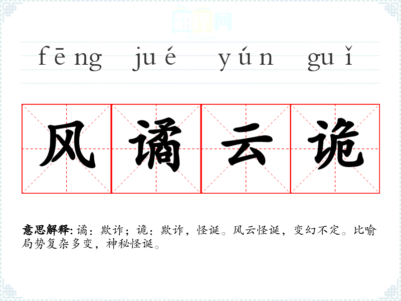 谲:欺诈;诡:欺诈,怪诞。风云怪诞,变幻不定。比喻局势复杂多变,神秘怪诞。