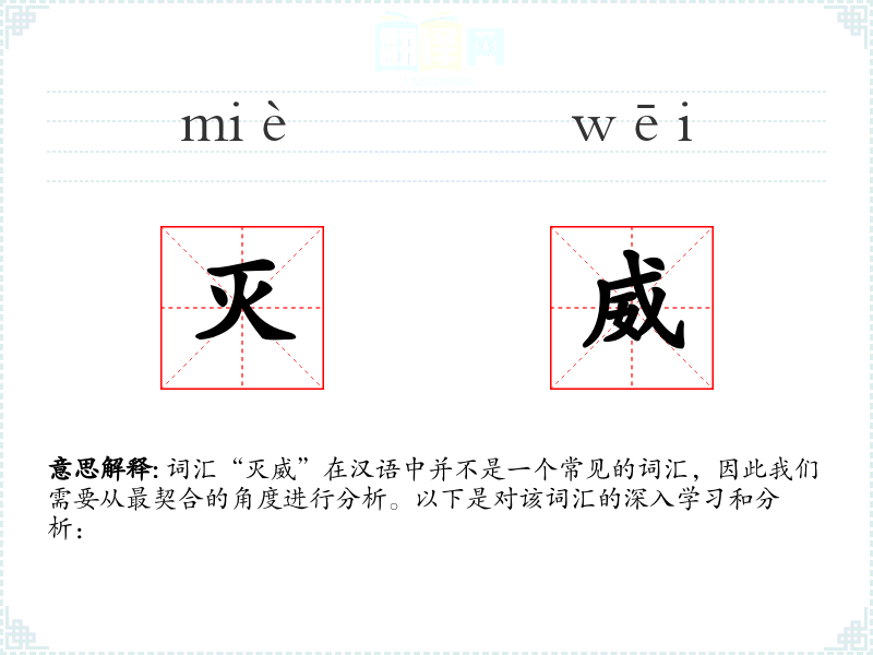 由于“灭威”不是一个常用词汇,它在不同的语境下可能会有不同的解释。在文学作品中,可能用来形容某人或某物失去了原有的威势或影响力。在口语或专业领域中,可能较少使用。