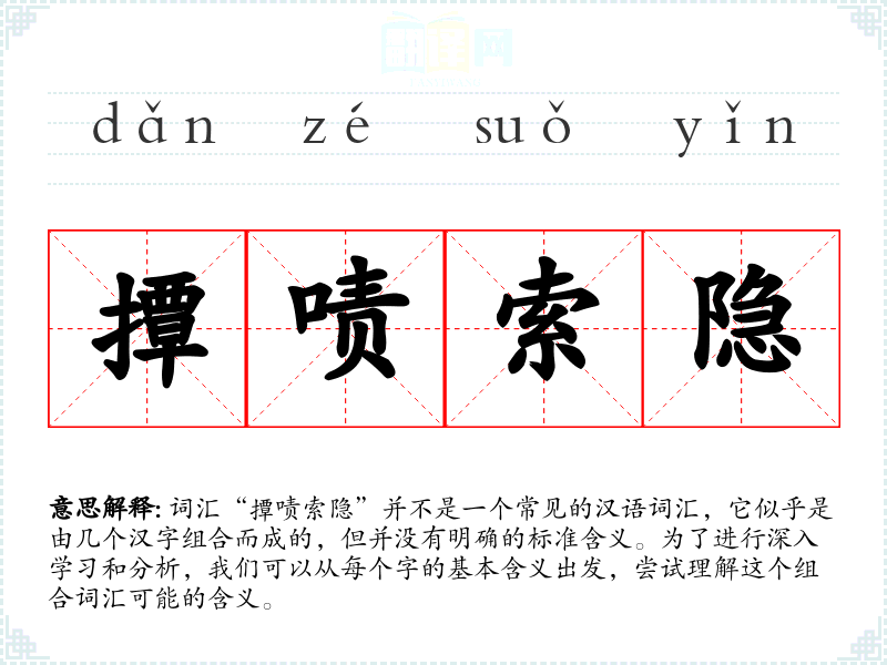 词汇“撢啧索隐”并不是一个常见的汉语词汇,它似乎是由几个汉字组合而成的,但并没有明确的标准含义。为了进行深入学习和分析,我们可以从每个字的基本含义出发,尝试理解这个组合词汇可能的含义。