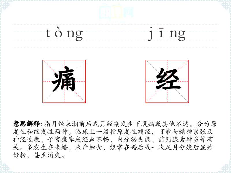 1.指月经来潮前后或月经期发生下腹痛或其他不适。分为原发性和继发性两种。临床上一般指原发性痛经,可能与精神紧张及神经过敏、子宫痉挛或经血不畅、内分泌失调、前列腺素增多等有关。多发生在未婚、未产妇女,经常在婚后或一次足月分娩后显著好转,甚至消失。
