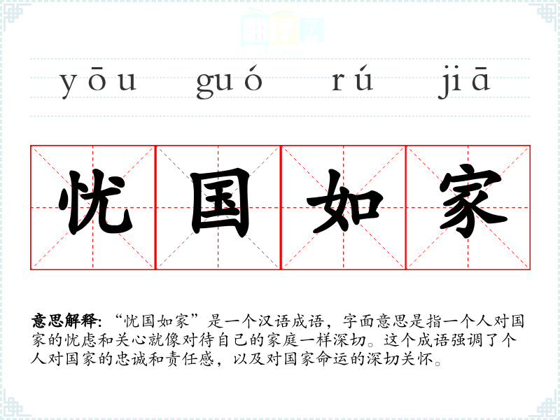 “忧国如家”是一个汉语成语,字面意思是指一个人对国家的忧虑和关心就像对待自己的家庭一样深切。这个成语强调了个人对国家的忠诚和责任感,以及对国家命运的深切关怀。