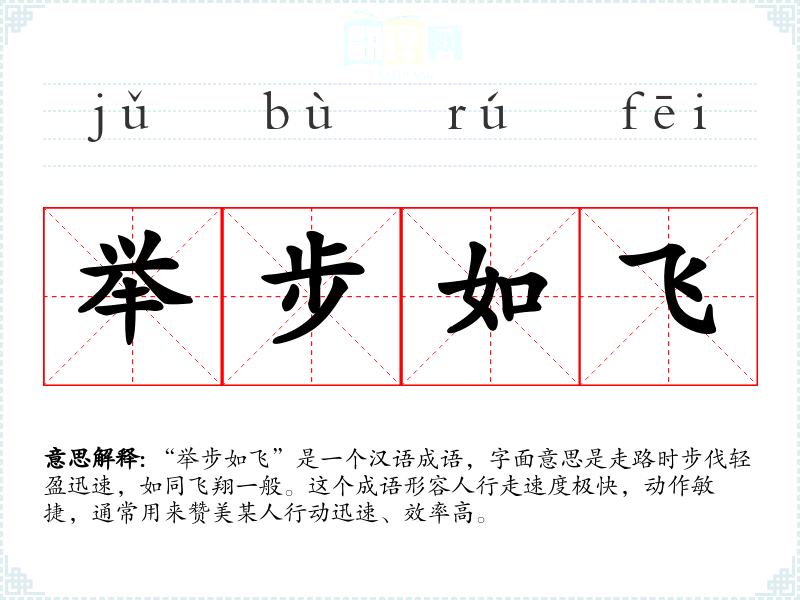 “举步如飞”这个成语的词源较为模糊,但它体现了汉语中对动作描述的细腻和形象。随着时间的推移,这个成语的使用逐渐固定,成为描述快速行动的常用表达。