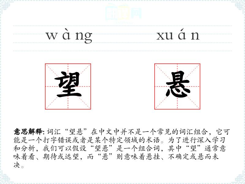 - 在专业领域,如果“望悬”是一个特定术语,那么它可能指的是某种特定的状态或条件,需要具体领域的知识来解释。