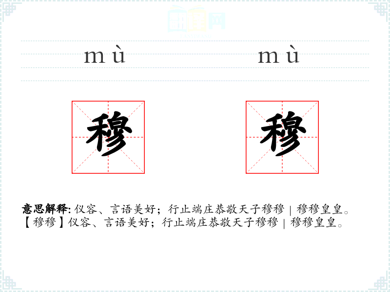 仪容、言语美好;行止端庄恭敬天子穆穆|穆穆皇皇。 【穆穆】仪容、言语美好;行止端庄恭敬天子穆穆|穆穆皇皇。