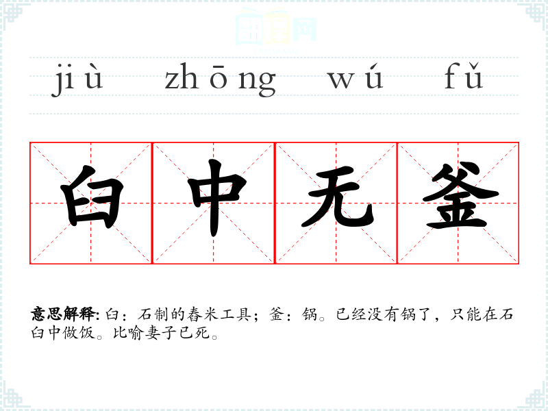 臼:石制的舂米工具;釜:锅。已经没有锅了,只能在石臼中做饭。比喻妻子已死。
