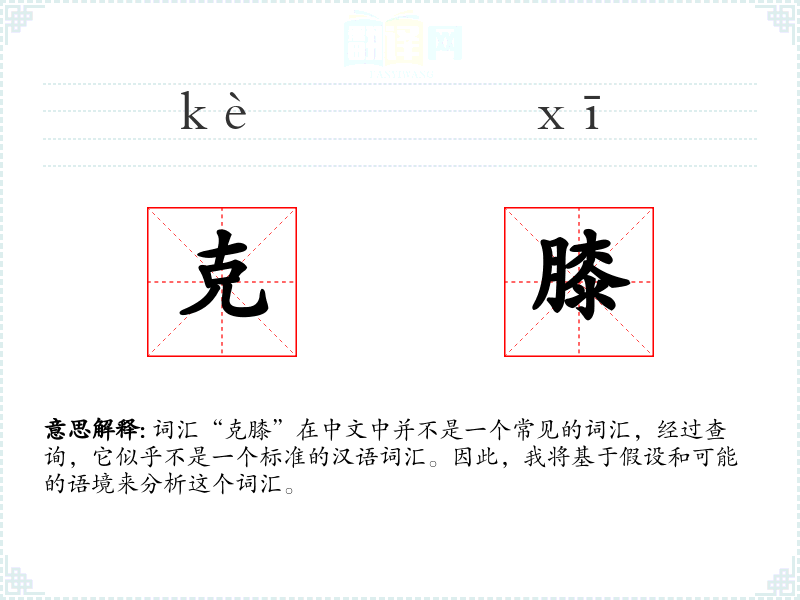词汇“克膝”在中文中并不是一个常见的词汇,经过查询,它似乎不是一个标准的汉语词汇。因此,我将基于假设和可能的语境来分析这个词汇。