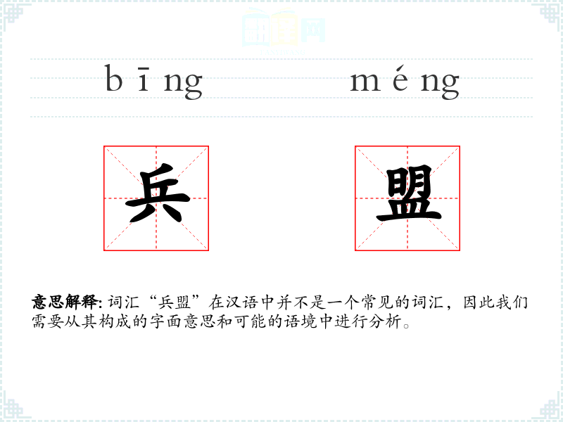 词汇“兵盟”在汉语中并不是一个常见的词汇,因此我们需要从其构成的字面意思和可能的语境中进行分析。