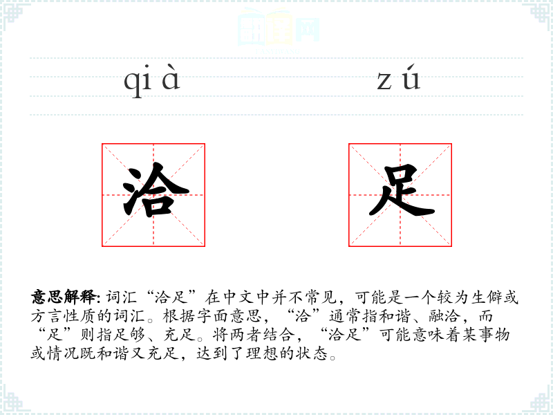 词汇“洽足”在中文中并不常见,可能是一个较为生僻或方言性质的词汇。根据字面意思,“洽”通常指和谐、融洽,而“足”则指足够、充足。将两者结合,“洽足”可能意味着某事物或情况既和谐又充足,达到了理想的状态。
