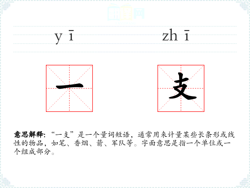 “一支”是一个量词短语,通常用来计量某些长条形或线性的物品,如笔、香烟、箭、军队等。字面意思是指一个单位或一个组成部分。
