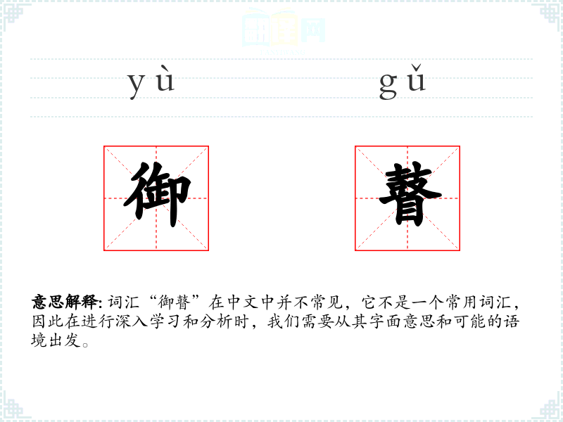 词汇“御瞽”在中文中并不常见,它不是一个常用词汇,因此在进行深入学*和分析时,我们需要从其字面意思和可能的语境出发。