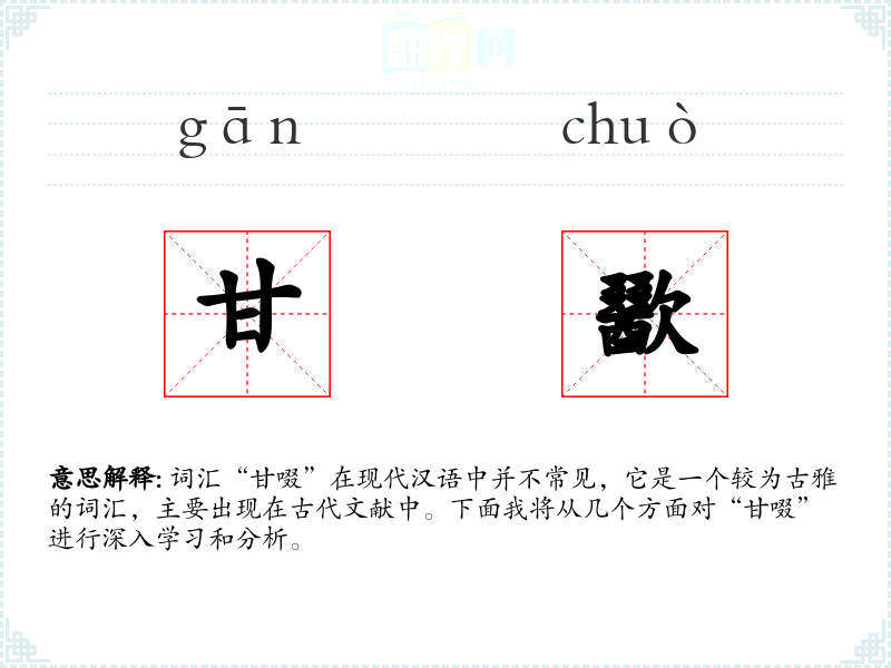 词汇“甘啜”在现代汉语中并不常见,它是一个较为古雅的词汇,主要出现在古代文献中。下面我将从几个方面对“甘啜”进行深入学习和分析。