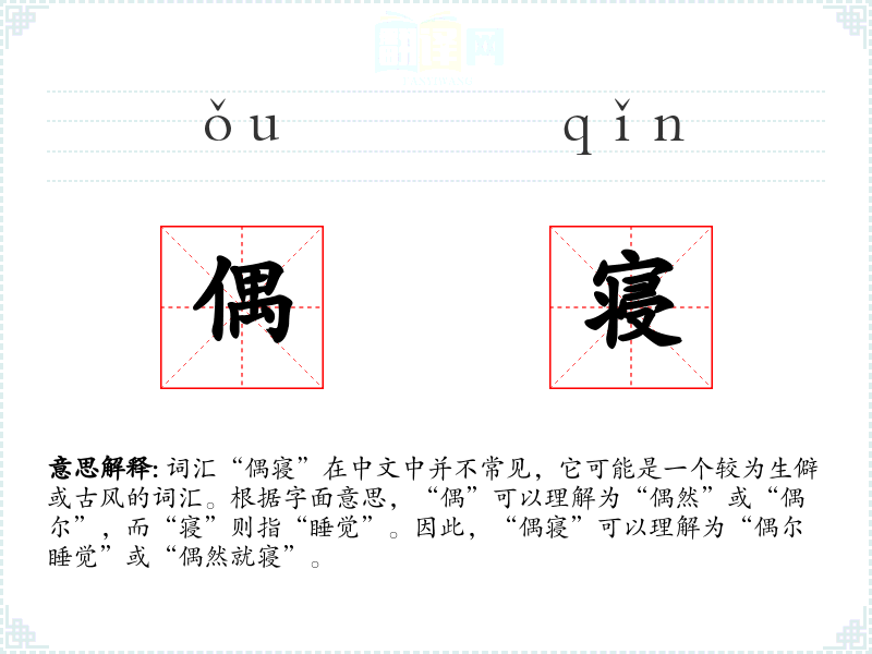 词汇“偶寝”在中文中并不常见,它可能是一个较为生僻或古风的词汇。根据字面意思,“偶”可以理解为“偶然”或“偶尔”,而“寝”则指“睡觉”。因此,“偶寝”可以理解为“偶尔睡觉”或“偶然就寝”。