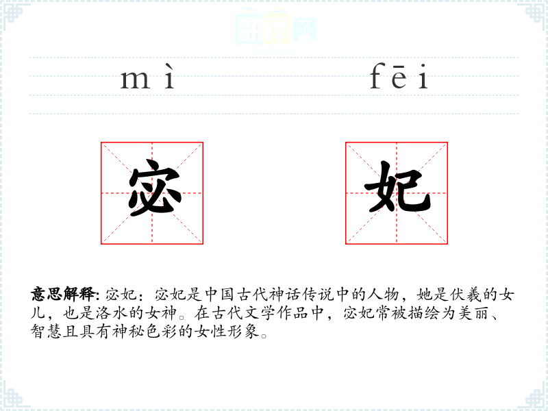 宓妃:宓妃是**古代神话传说中的人物,她是伏羲的女儿,也是洛水的女神。在古代文学作品中,宓妃常被描绘为美丽、智慧且具有神秘色彩的女性形象。
