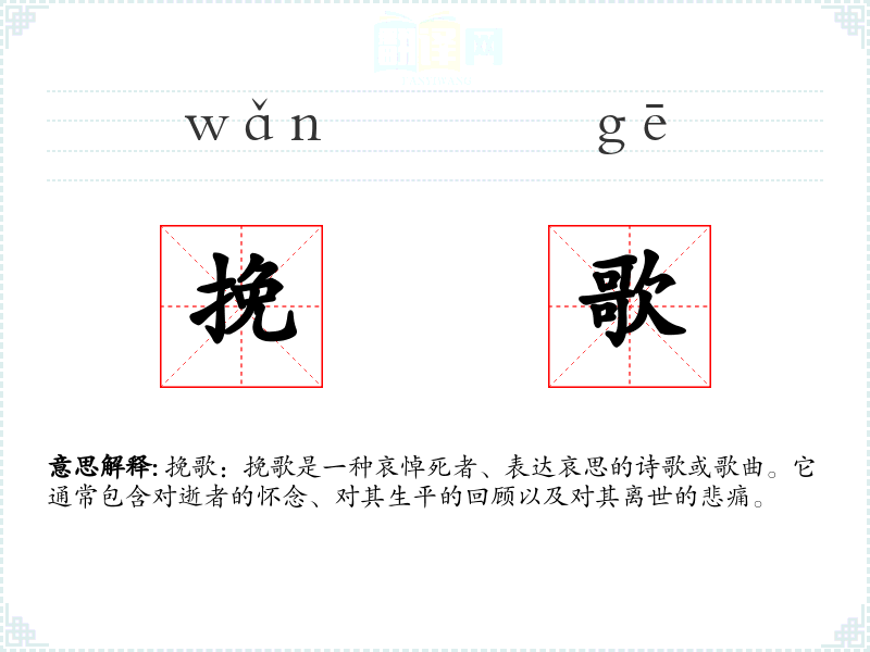 理解:挽歌是一种深具情感和文化意义的诗歌或歌曲,它不仅是对逝者的哀悼,也是对生命和死亡的深刻反思。 重要性:在语言学习和表达中,挽歌提醒我们珍惜生命、尊重逝者,并在悲伤中寻找慰藉和力量。