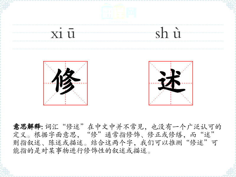 “修述”这个词虽然不常见,但它提供了一种对事物进行修饰性描述的方式,强调了细节和艺术性。在语言学*和表达中,了解和运用这样的词汇可以丰富我们的表达方式,使我们的叙述更加生动和有深度。