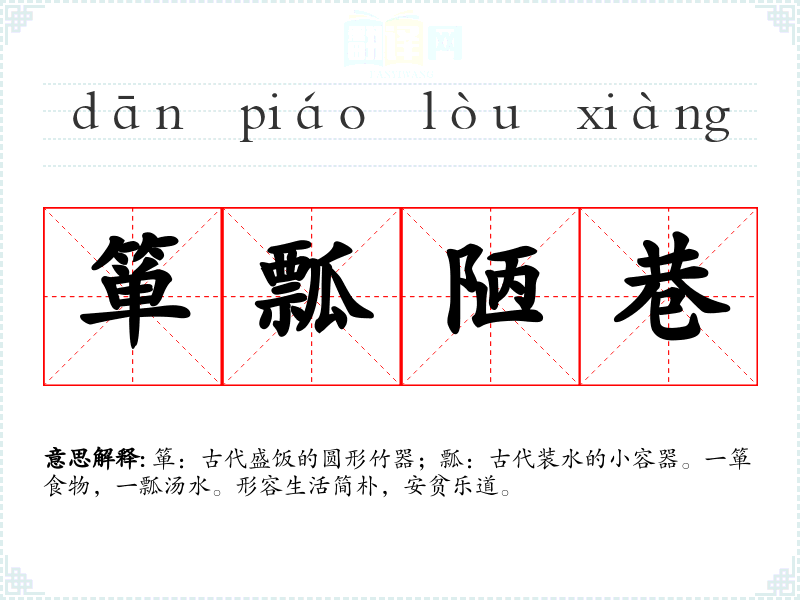 箪:古代盛饭的圆形竹器;瓢:古代装水的小容器。一箪食物,一瓢汤水。形容生活简朴,安贫乐道。