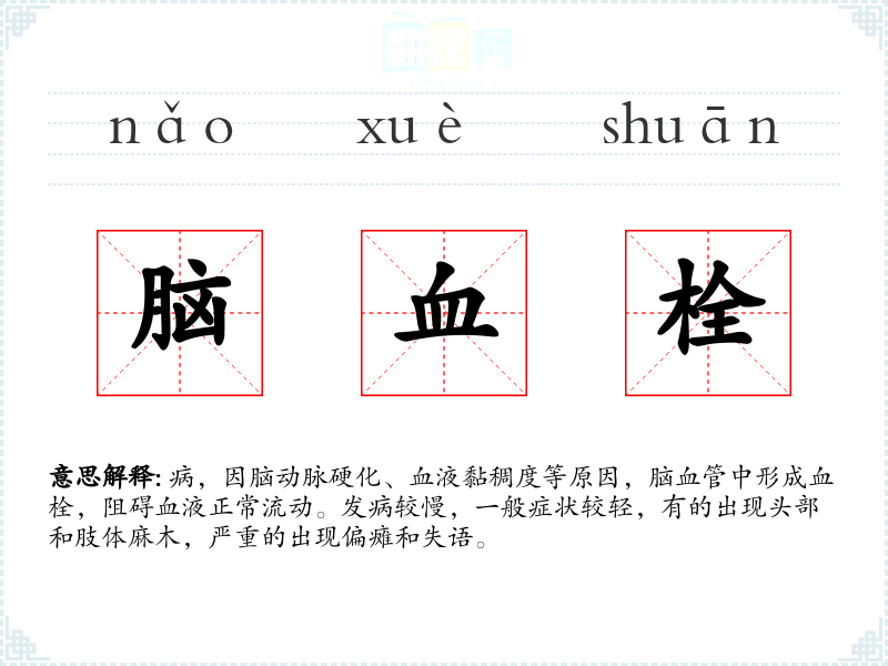 病,因脑动脉硬化、血液黏稠度等原因,脑血管中形成血栓,阻碍血液正常流动。发病较慢,一般症状较轻,有的出现头部和肢体麻木,严重的出现偏瘫和失语。