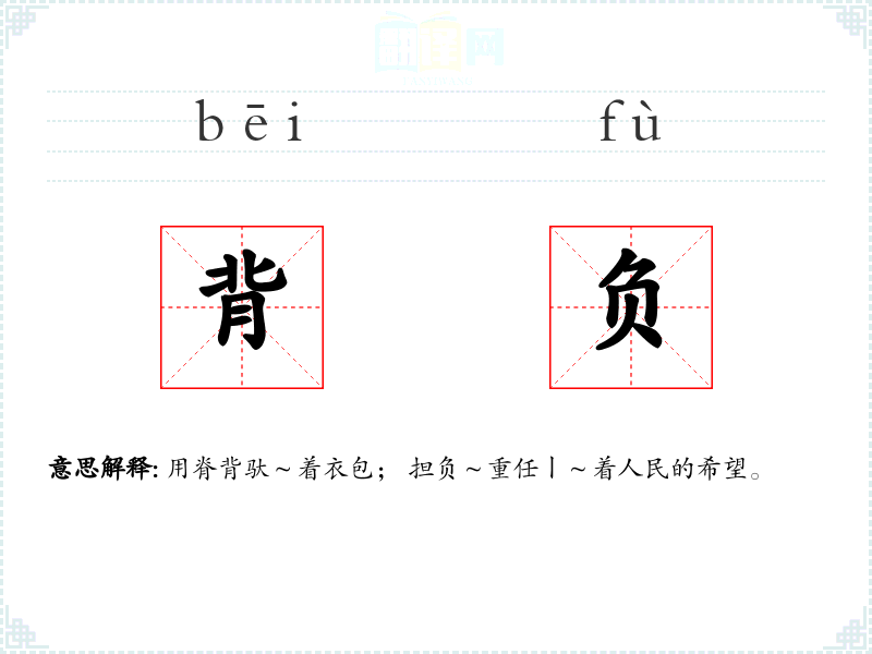 用脊背驮~着衣包; 担负~重任ㄧ~着人民的希望。
