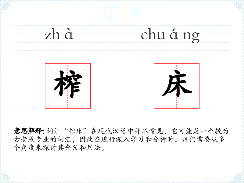 词汇“榨床”在现代汉语中并不常见,它可能是一个较为古老或专业的词汇,因此在进行深入学*和分析时,我们需要从多个角度来探讨其含义和用法。