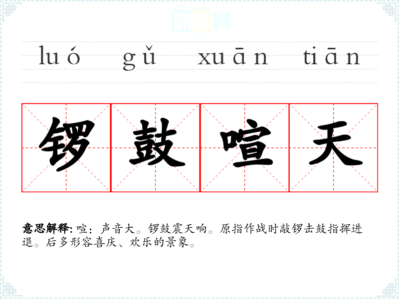喧:声音大。锣鼓震天响。原指作战时敲锣击鼓指挥进退。后多形容喜庆、欢乐的景象。
