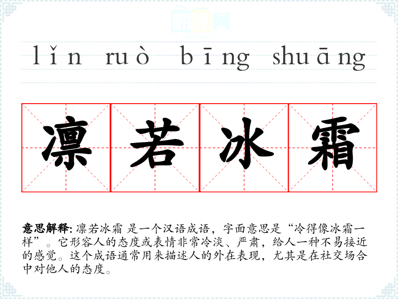 凛若冰霜 是一个汉语成语,字面意思是“冷得像冰霜一样”。它形容人的态度或表情非常冷淡、严肃,给人一种不易接近的感觉。这个成语通常用来描述人的外在表现,尤其是在社交场合中对他人的态度。