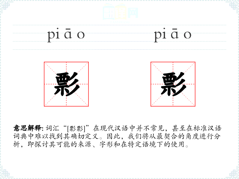 词汇“[彯彯]”在现代汉语中并不常见,甚至在标准汉语词典中难以找到其确切定义。因此,我们将从最契合的角度进行分析,即探讨其可能的来源、字形和在特定语境下的使用。