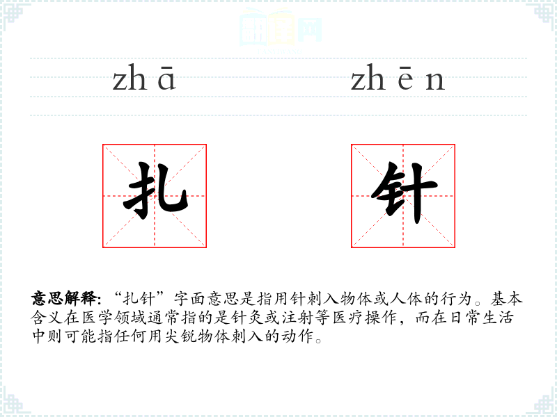 “扎针”一词源于古代汉语,其中“扎”字有刺入、穿透的意思,“针”则指细长的尖锐物体。随着医学技术的发展,“扎针”逐渐成为专业术语,特指医疗操作中的注射和针灸。