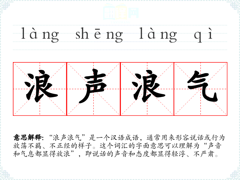 “浪声浪气”是一个汉语成语,通常用来形容说话或行为放荡不羁、不正经的样子。这个词汇的字面意思可以理解为“声音和气息都显得放浪”,即说话的声音和态度都显得轻浮、不严肃。