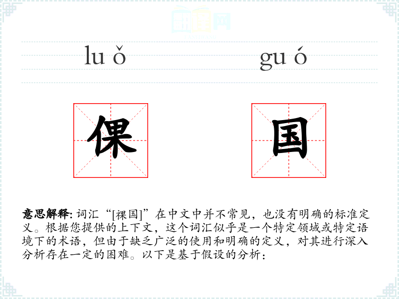 由于“[祼国]”不是一个标准的中文词汇,我们无法提供一个确切的字面意思和基本含义。它可能是某个特定领域(如历史、文学、神话传说等)的专有名词,或者是某个特定社群中的术语。