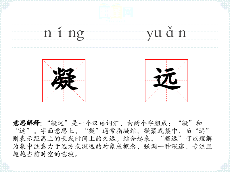 “凝远”是一个汉语词汇,由两个字组成:“凝”和“远”。字面意思上,“凝”通常指凝结、凝聚或集中,而“远”则表示距离上的长或时间上的久远。结合起来,“凝远”可以理解为集中注意力于远方或深远的对象或概念,强调一种深邃、专注且超越当前时空的意境。