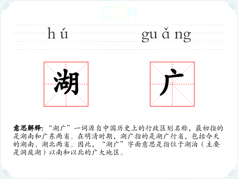 “湖广”一词源自**历史上的行政区划名称,最初指的是湖南和广东两省。在明清时期,湖广指的是湖广行省,包括今天的湖南、湖北两省。因此,“湖广”字面意思是指位于湖泊(主要是洞庭湖)以南和以北的广大地区。