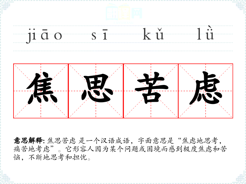 焦思苦虑 是一个汉语成语,字面意思是“焦虑地思考,痛苦地考虑”。它形容人因为某个问题或困境而感到极度焦虑和苦恼,不断地思考和担忧。