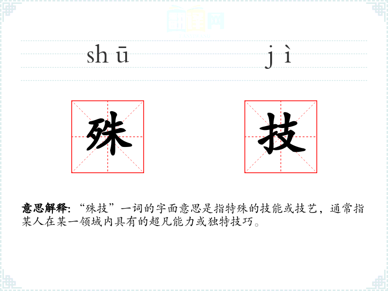 “殊技”一词的字面意思是指特殊的技能或技艺,通常指某人在某一领域内具有的超凡能力或独特技巧。