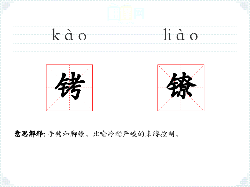 手铐和脚镣。比喻冷酷严峻的束缚控制。