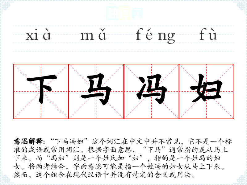 “下马冯妇”这个词汇在中文中并不常见,它不是一个标准的成语或常用词汇。根据字面意思,“下马”通常指的是从马上下来,而“冯妇”则是一个姓氏加“妇”,指的是一个姓冯的妇女。将两者结合,字面意思可能是指一个姓冯的妇女从马上下来。然而,这个组合在现代汉语中并没有特定的含义或用法。