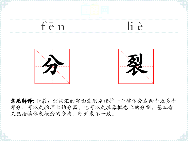 分裂:该词汇的字面意思是指将一个整体分成两个或多个部分,可以是物理上的分离,也可以是抽象概念上的分割。基本含义包括物体或概念的分离、断开或不一致。