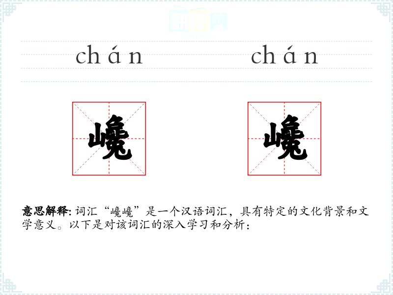 词汇“巉巉”是一个汉语词汇,具有特定的文化背景和文学意义。以下是对该词汇的深入学*和分析: