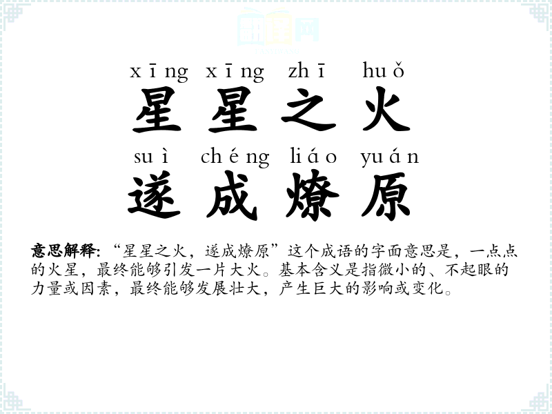 “星星之火,遂成燎原”这个成语的字面意思是,一点点的火星,最终能够引发一片大火。基本含义是指微小的、不起眼的力量或因素,最终能够发展壮大,产生巨大的影响或变化。