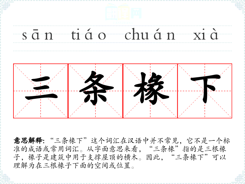 “三条椽下”这个词汇在汉语中并不常见,它不是一个标准的成语或常用词汇。从字面意思来看,“三条椽”指的是三根椽子,椽子是建筑中用于支撑屋顶的横木。因此,“三条椽下”可以理解为在三根椽子下面的空间或位置。