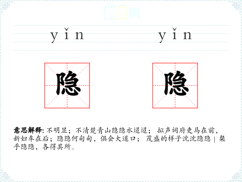 不明显;不清楚青山隐隐水迢迢; 拟声词府吏马在前,新妇车在后;隐隐何甸甸,俱会大道口; 茂盛的样子沈沈隐隐|粲乎隐隐,