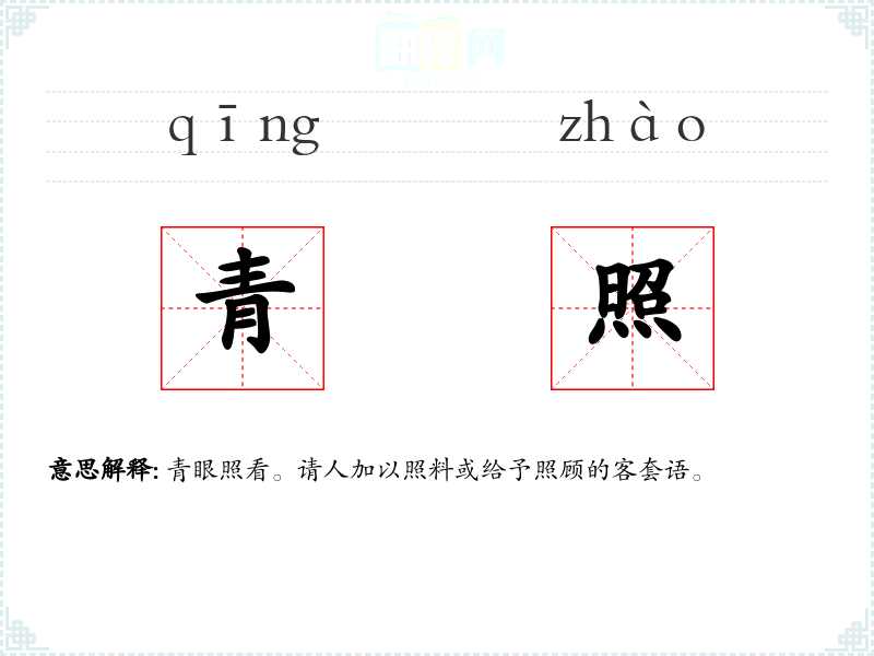 青眼照看。请人加以照料或给予照顾的客套语。