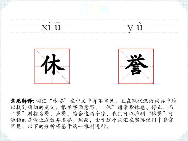 由于“休誉”不是一个常用词汇,其词源和历史演变难以考证。可能是由“休”和“誉”两个常用词汇组合而成的新词,用以表达特定的意境或情感。