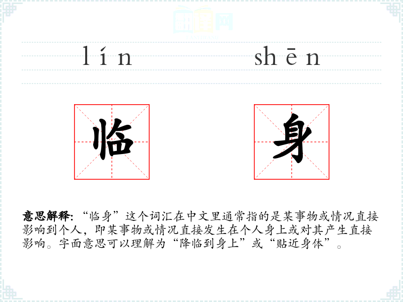 “临身”由“临”和“身”两个字组成。“临”字有接近、到达的意思,“身”指身体或个人。这个词汇在古代文献中已有使用,随着时间的推移,其基本含义保持相对稳定。