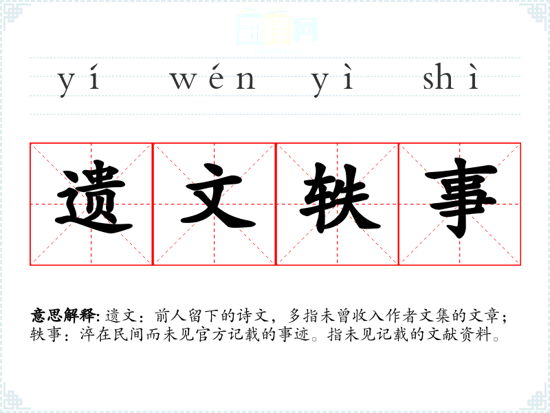 遗文:前人留下的诗文,多指未曾收入作者文集的文章;轶事:淬在民间而未见官方记载的事迹。指未见记载的文献资料。
