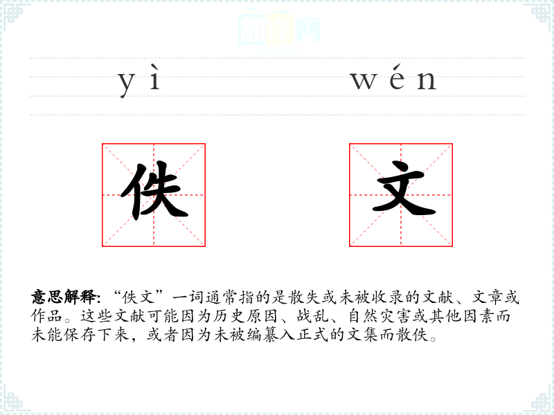 “佚文”一词通常指的是散失或未被收录的文献、文章或作品。这些文献可能因为历史原因、战乱、自然灾害或其他因素而未能保存下来,或者因为未被编纂入正式的文集而散佚。