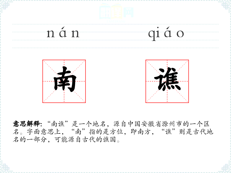 “南谯”是一个地名,源自**安徽省滁州市的一个区名。字面意思上,“南”指的是方位,即南方,“谯”则是古代地名的一部分,可能源自古代的谯国。